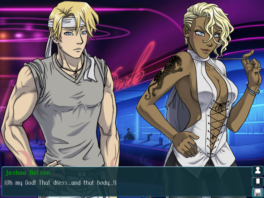 Damien is a leader of the rebels that contacts you shortly in the game and the last potential suitor for Lisa. There is never made clear who are the rebels and what are they rebelling against. I can just imagine the writer of the game scratching his? head and thinking what other piece of implausibility he can make us swallow. Then he watched "Star Wars" and while shouting "Eureka" added "rebels". Damien values physical strength over everything else and the quickest way to get his sympathies is by beating him and his lackeys in fights. His personal quest (if there is such) cannot be completed playing as Joshua.