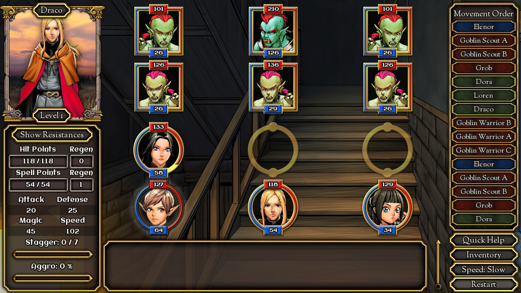 I’ll come out and say, that I really liked the gameplay and it was the best part of the game. Riva Celso really knows how to make his games engaging. I fancied combat in “Planet Stronghold”, despite the fact that he amped the difficulty by increasing the miss factor, which was simply not fair. Loren’s combat is much more complex and refined. The fights are similar to those of “Final Fantasy” and other jRPG games. The combatants are in two rows. The back row can use magic and ranged attacks, while the front one can use melee, ranged (at a penalty) attacks and magic. You can spend skills to buy special attacks that will get more and more useful in the long run. I also offered a prayer to all the gods that I didn’t have to suffer a “missed attack’ notification ten times in a row like frequently happened in PS.