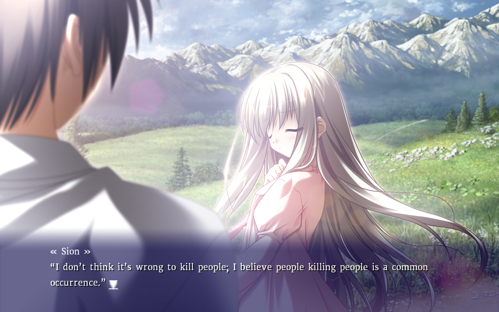 Moreover, I wouldn't be an angry reviewer is I didn't mention some other instances of particularly bad writing. The author generates mystery by employing some very underhanded techniques that would make you throw the book across the room... sadly, you cannot do the same with a VN. In the beginning of the game our protagonist Ryou constantly refers to Sion as 'she' or 'her', in order to keep suspense whom he is talking about. But why the fuck?!! Sion is not a secret character, she is mentioned in the description. There is no reason for Ryou to refer to her in such a way, as there is no mystery. But that can be forgivable, even if it makes zero sense. However, we soon encounter another mystery generation device. Are you fucking ready?!! The dreaded "screen cuts to black just as another character tells the protagonist some important information" rears its ugly head. Now that's just a low blow. In other words, the first few hours are so badly written due to the overuse of bad tropes, that it was just painful to read.